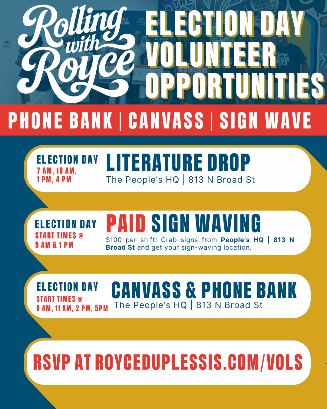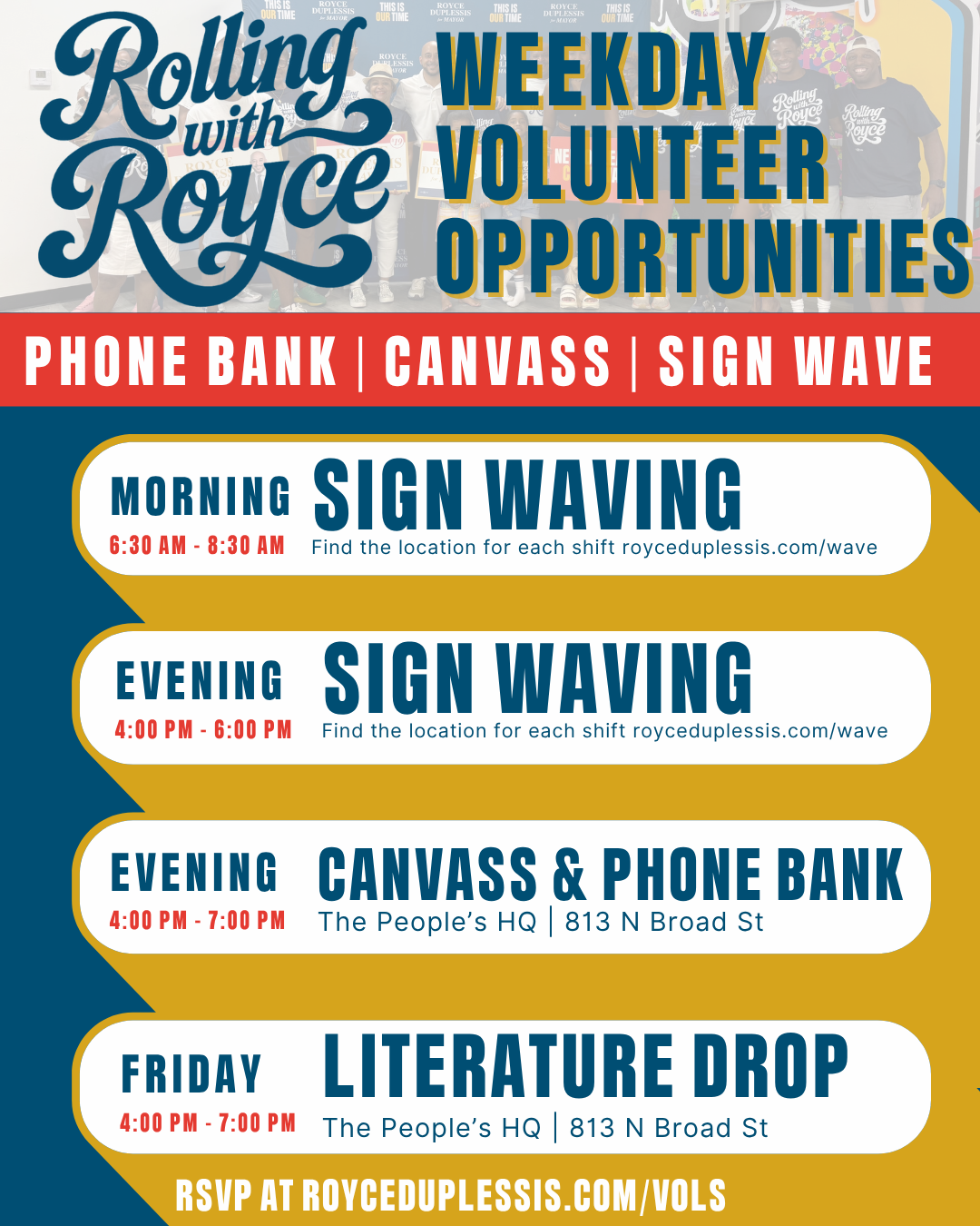 Please wear your Rolling with Royce Swag during your shift! Don't have one? We got you! Come by the office and get a shirt. Let’s win this — together.